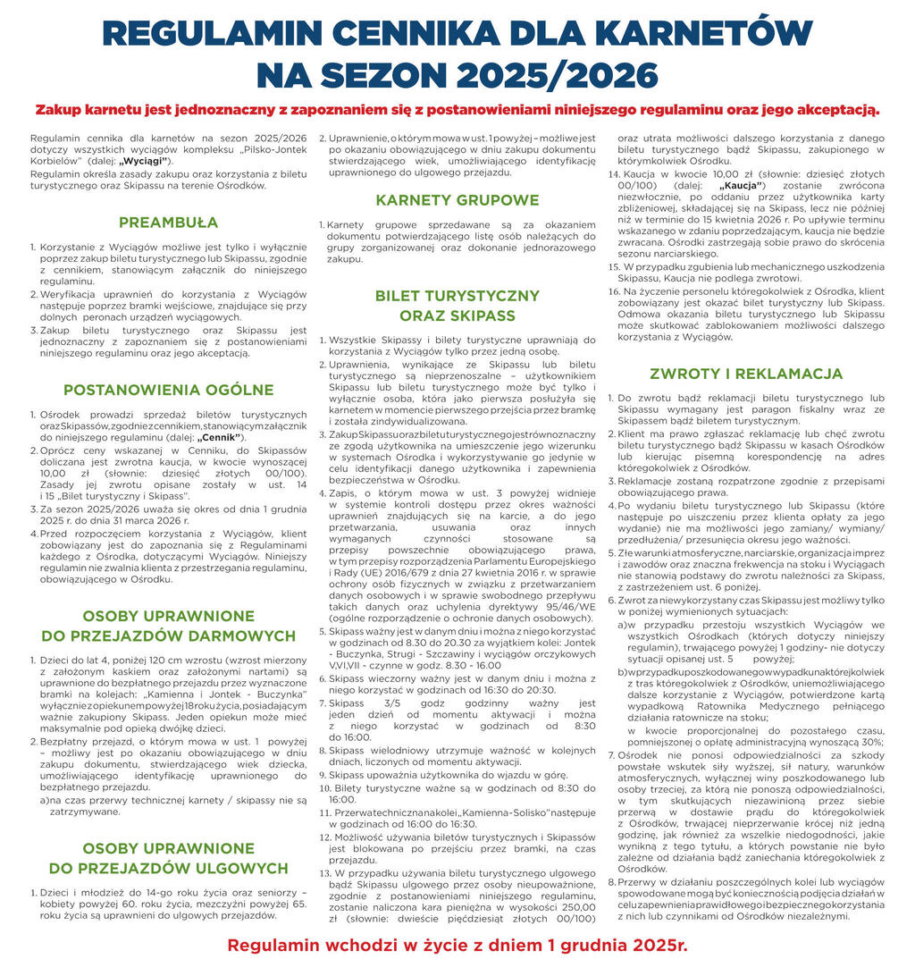 Prosimy o zapoznanie się z regulaminem Szkoły Narciarskiej – Regulamin korzystania z wyciągów, kolei i tras zjazdowych.